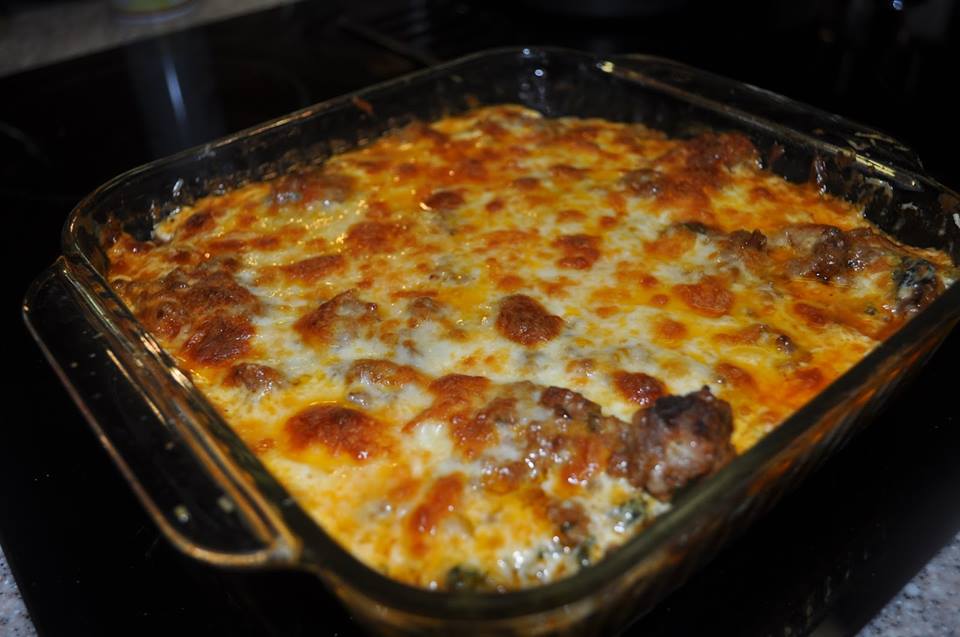 Directions :Brown the hamburger with the onion; drain off the fat. Mix in the garlic powder and spaghetti sauce; season to taste and heat until bubbly. Meanwhile, soften the cream cheese in a medium-size microwaveable bowl for about 40-60 seconds. Stir until creamy; beat in the egg and pepper with a spoon until well mixed. Blend in the spinach. Spread half of the meat mixture evenly in the bottom of a greased, 8 x 8" glass baking pan. Spread the spinach mixture over the meat; top with the mozzarella, then the rest of the meat. It may not completely cover the top, but that's ok. Sprinkle with the parmesan cheese. Bake at 350ยบ about 30 minutes until hot and bubbly.Number of Servings: 8
